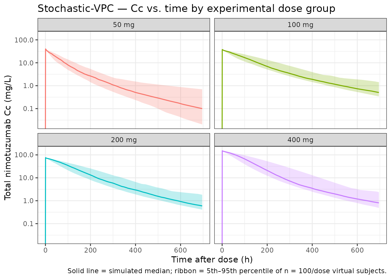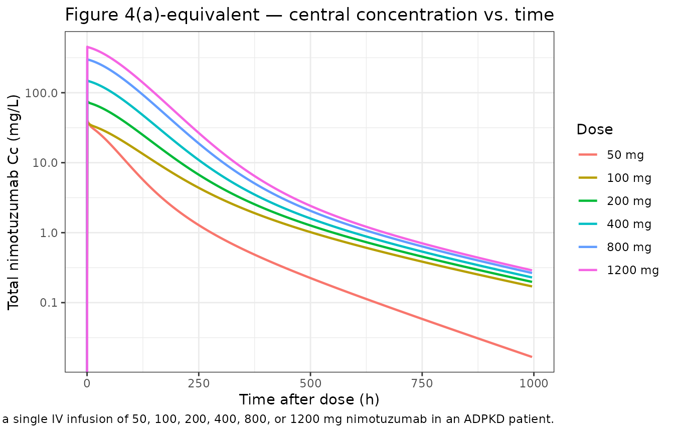 #> 5 Free Cc above S50 (8.57 mg/L) duration @ 100 mg (ty… NA 174. hThe simulated typical-patient Vss exactly matches the published 2.64 L (V1 + V2 are direct fixed-effect parameters; for doses other than 50 mg no covariate scaling applies). The typical Cmax at the 100-mg dose is approximately dose ÷ V1 = 100 / 2.63 ≈ 38 mg/L immediately after infusion end, consistent with the y-axis of Figure 4(a). The typical Cmax at the 50-mg dose is approximately dose ÷ (V1 × 0.47) = 50 / 1.236 ≈ 40 mg/L — i.e. higher than the un-adjusted 50 / 2.63 ≈ 19 mg/L value would be — which is what produces the faster early decline of the 50 mg curve in Figure 4A (smaller central volume → higher initial concentration and higher free-drug exposure that drives accelerated TMDD/mediator clearance). The simulated free-concentration window above S50 = 8.57 mg/L provides the duration that the paper’s Discussion uses to argue that 100 mg is the maximum effective single dose.