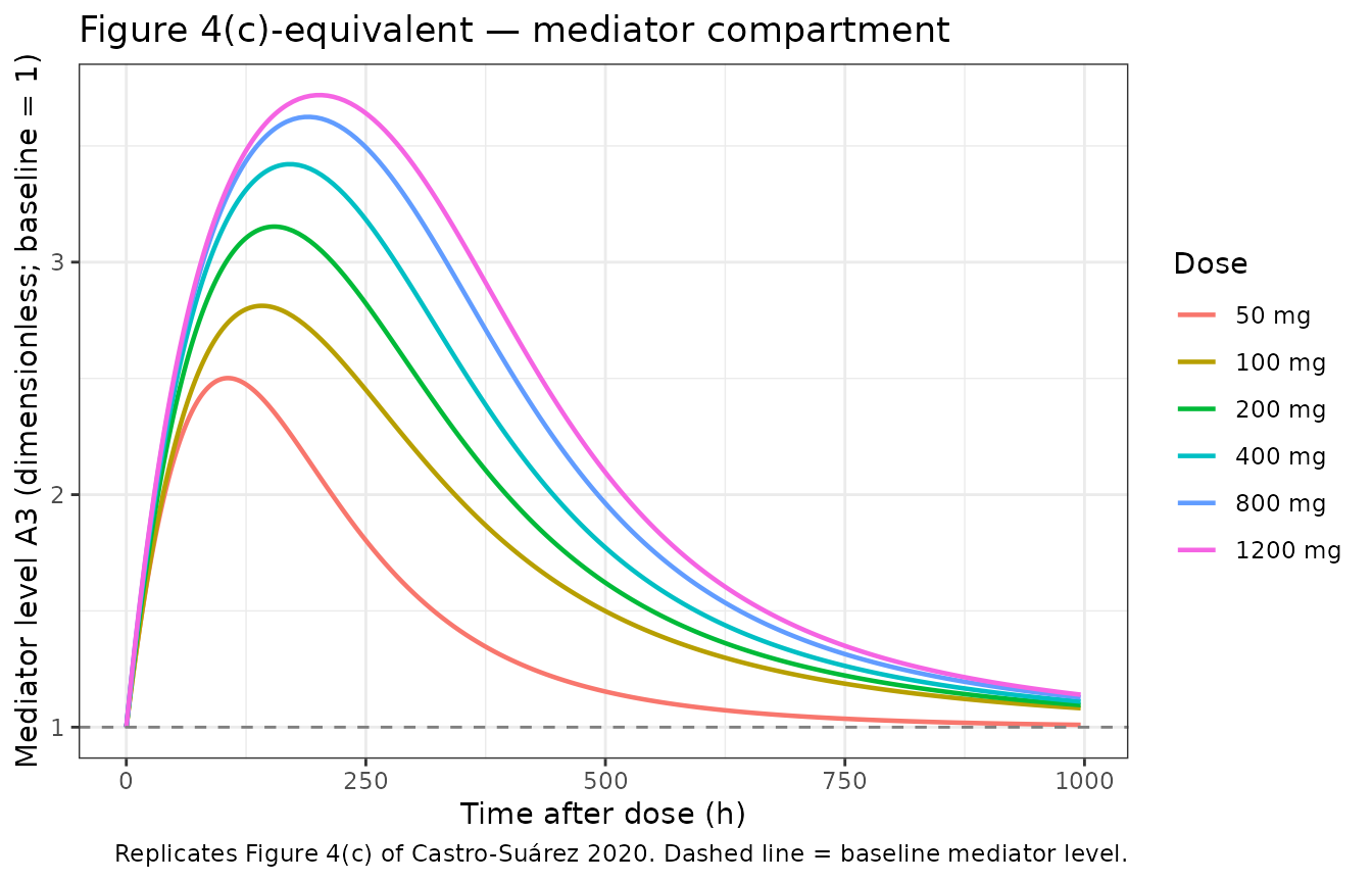 effect. The paper labels the turnover state “A3” or “mediator.” The packaged model uses the canonical nlmixr2lib compartment nameeffect(the registered indirect-response / turnover compartment, used identically byMa_2020_sarilumab_anc.R). The mediator’s level multiplies the linear CL term in the central ODE. - Single-cohort study. The model is fit to one Cuban single-center phase I trial (n = 20, single-dose, four cohorts of 5 patients). Generalization to multiple-dose regimens, other indications (the paper contrasts with breast-cancer PK from a separate study), or pediatric / renal-impaired populations is not supported by the source data.