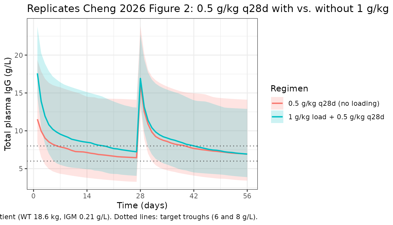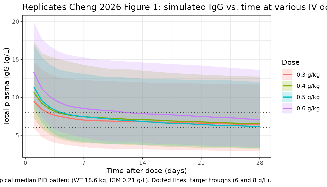 - Dosing: Modelled as IV bolus into the central compartment. Cheng 2026 describes “intravenous Ig” without specifying infusion duration; the paper’s own simulations are reported on the same single-event basis.
