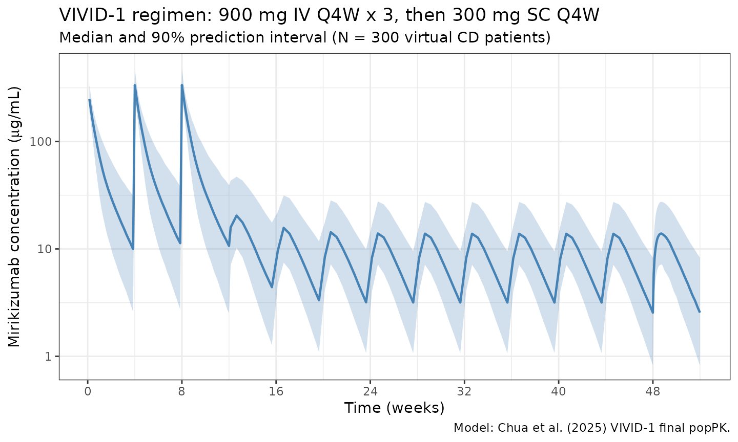 Replicate the VIVID-1 final population PK model reported by Chua et al. (2025) in patients with moderately-to-severely active Crohn’s disease. Mirikizumab is a humanized IgG4 monoclonal antibody that binds the p19 subunit of IL-23. The induction regimen is 900 mg IV every 4 weeks for three doses (weeks 0, 4, 8); the maintenance regimen is 300 mg SC every 4 weeks through week 52.