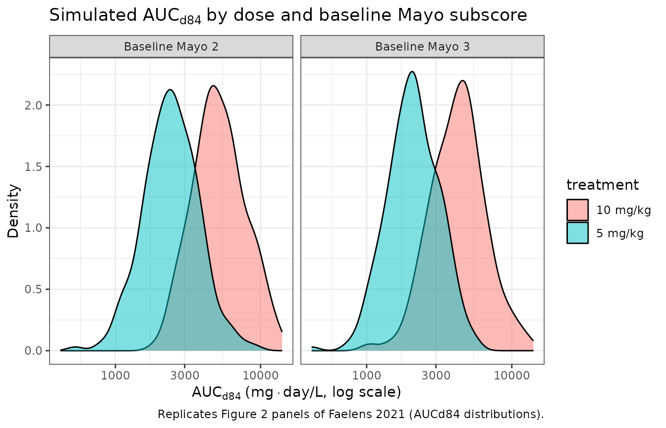 The Faelens 2021 simulation paper reports AUCd84 (area under the concentration-time curve from baseline to endoscopy at day 84) rather than classical single-dose AUCinf. Compute it via PKNCA on the [0, 84]-day interval, stratified by treatment and baseline Mayo subscore.