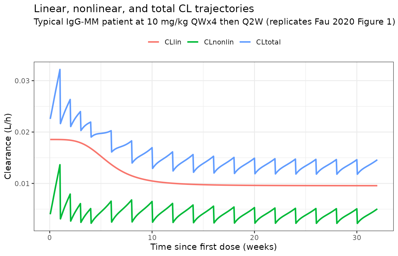 CLinfover a half-timeKCL ≈ 1,055 h ≈ 6 weeksfor the typical patient, andA drug–disease interaction in which patients who secrete IgG monoclonal protein (IgG-MM) have approximately twofold higher linear clearance than non-IgG-MM patients (and a roughly twofold longer transition time). The proposed mechanism is competition between endogenous IgG M-protein and therapeutic IgG mAb for FcRn-mediated recycling — abundant in IgG-MM, absent in non-IgG-MM.
