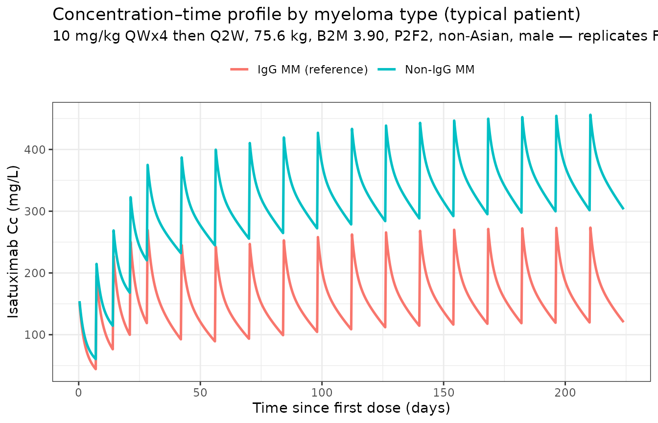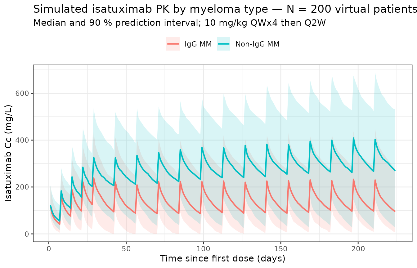 title = paste0("Simulated isatuximab PK by myeloma type — N = ", n_subj,