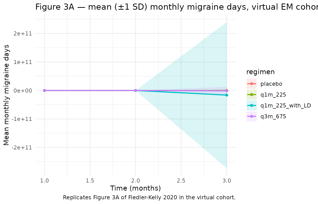 title = "Figure 3A — mean (±1 SD) monthly migraine days, virtual EM cohort",