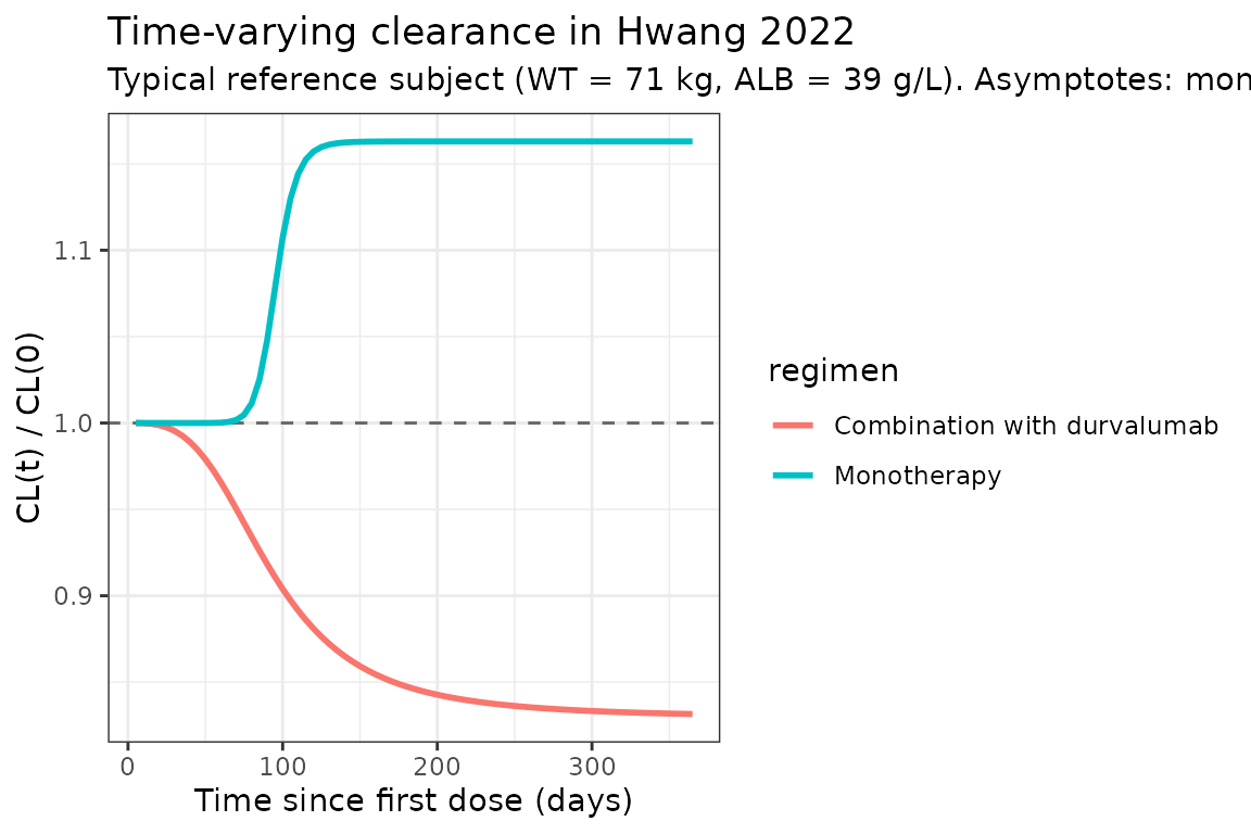 - ADA covariate. Postbaseline ADA-positive incidence is reported by Hwang 2022 (page 1607: 6.1% overall, 2.8% on monotherapy, 7.8% on combination), but ADA was tested and excluded from the final model (“no other covariates … were found to have significant impact”, page 1609). It is not implemented in the packaged model.