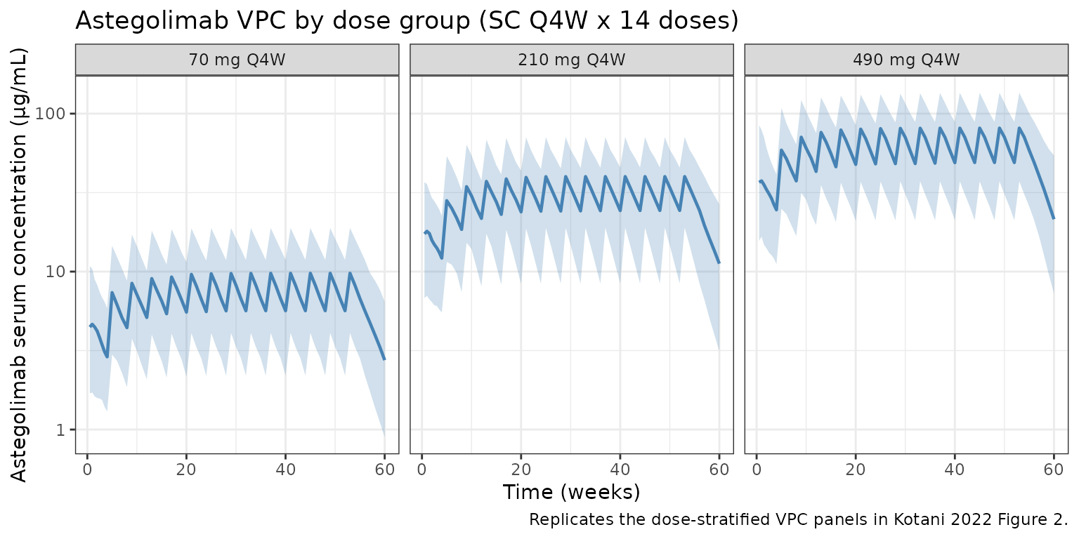 Kotani et al. (2022) Figure 2 shows observed vs. model-predicted astegolimab concentrations over time at 70, 210, and 490 mg SC Q4W. The plot below is the analogous VPC from the packaged model.