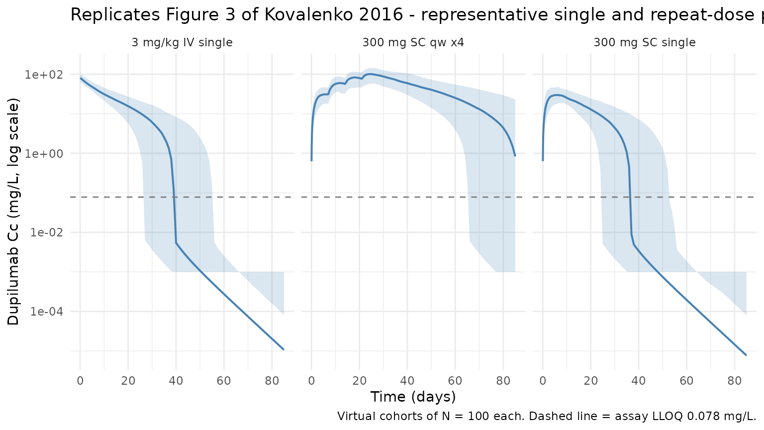 Kovalenko 2016 Figure 3 shows examples of log-scaled dupilumab concentration- time profiles under different single- and multiple-dose regimens, spanning the target-mediated phase as concentrations approach the LLOQ (0.078 mg/L). The plot below reproduces the 5-50-95 percentile envelopes for the three virtual cohorts above.