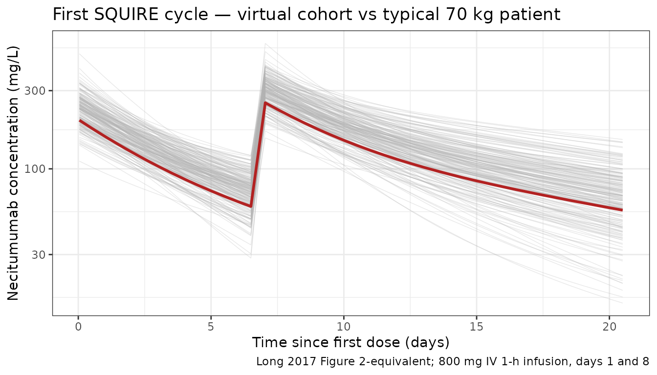 - Dose escalation and phase I cohorts. The virtual cohort only simulates the phase III 800 mg days-1-and-8-q3w SQUIRE regimen. Phase I and phase II dose-ranging cohorts (e.g., weekly and q2w schedules, 600 mg cohorts) are not reproduced here.