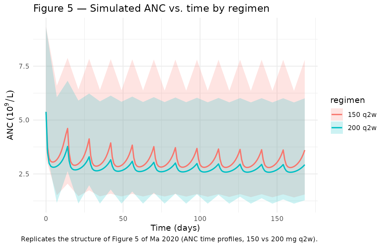 knitr::kable(ss_ranges, caption = "Simulated ANC nadir and percent reduction vs. Ma 2020 reported predictions.")| regimen | nadir_anc | trough_anc | mean_anc | pct_reduction_from_base | paper_reported_pct |