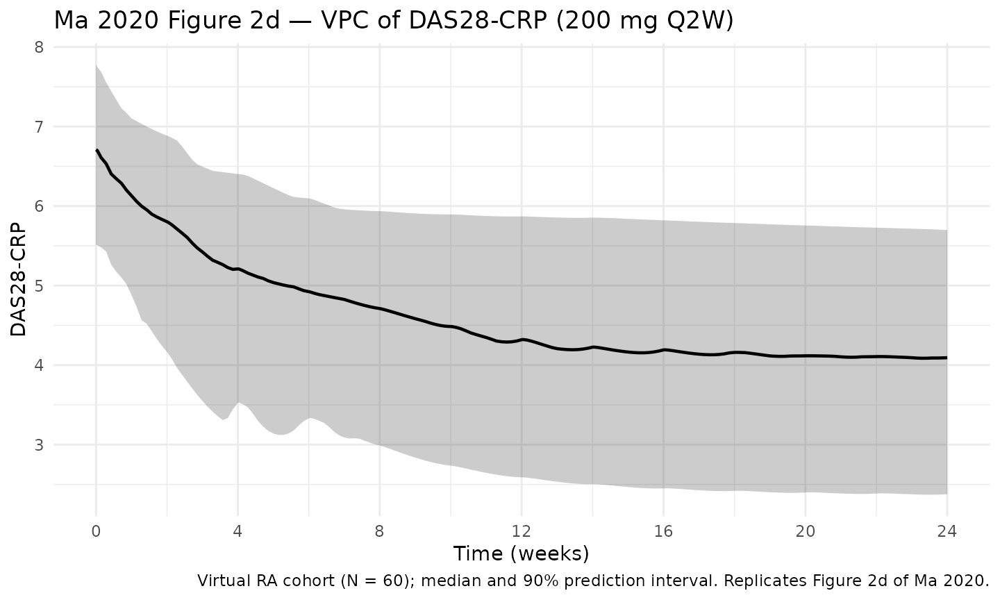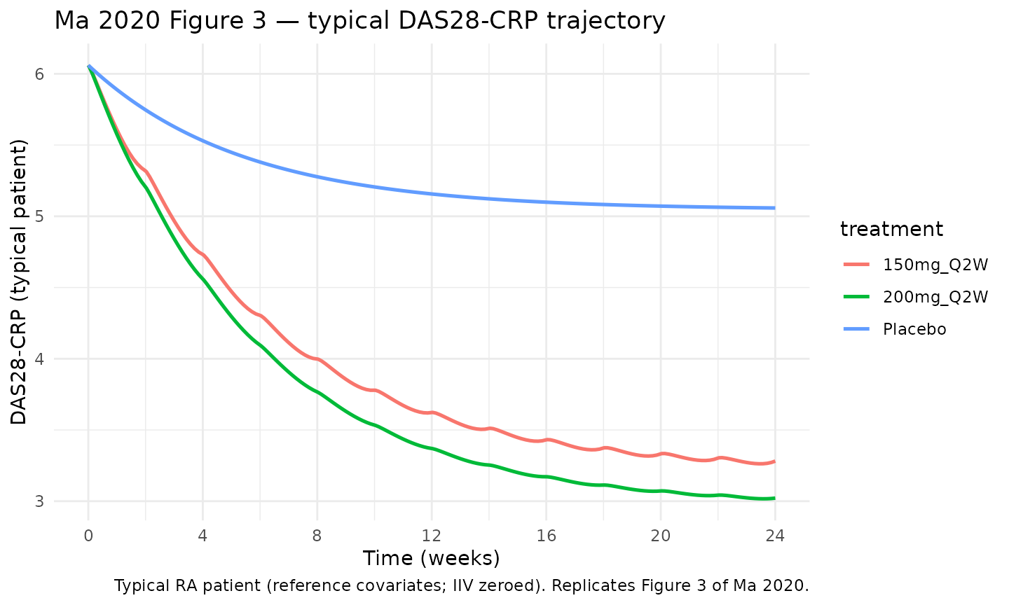 - reproduction of Ma 2020 Figure 3 typical-patient DAS28-CRP trajectories; (ii) reproduction of the paper’s week-24 reduction percentages (46.5% / 50.3% for 150 / 200 mg Q2W); and (iii) baseline and placebo-arm sanity checks.