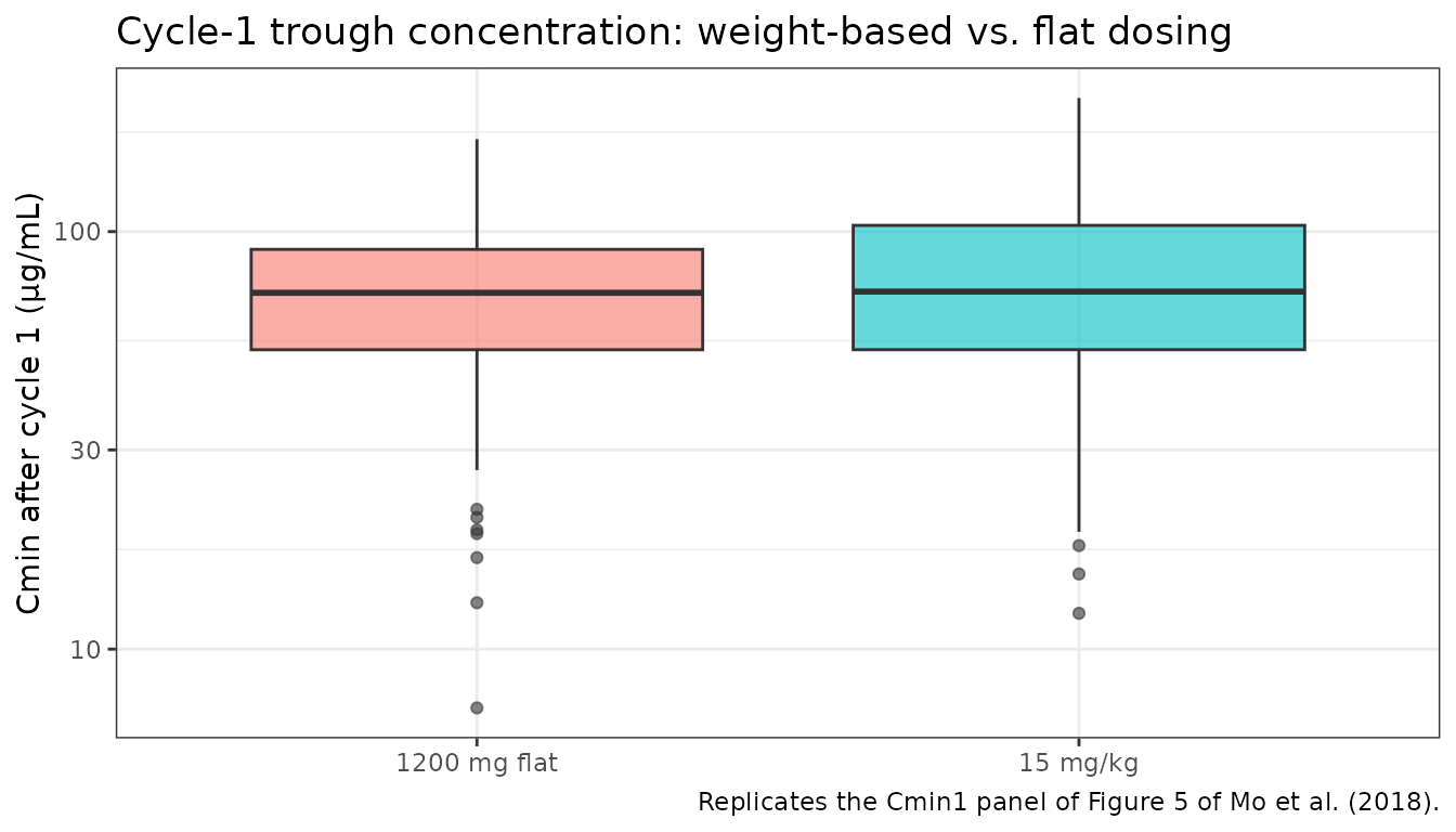 title = "Cycle-1 trough concentration: weight-based vs. flat dosing",
