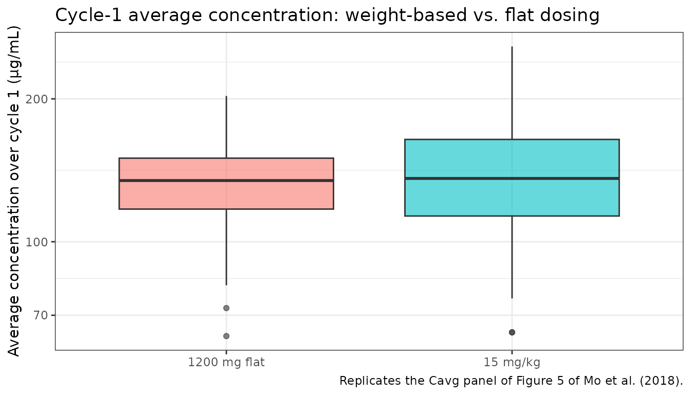 title = "Cycle-1 average concentration: weight-based vs. flat dosing",