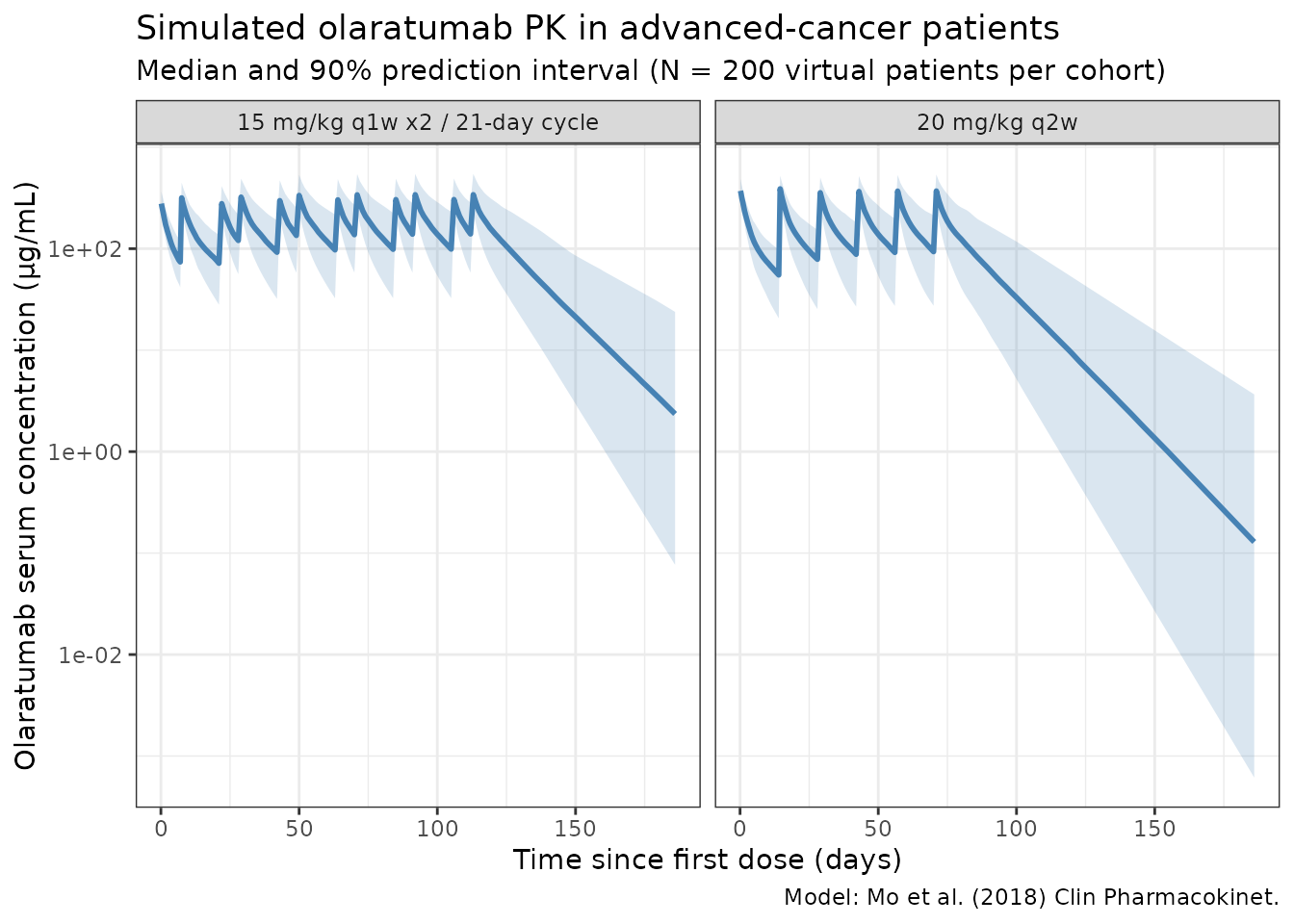 Simulate olaratumab (anti-PDGFRα human IgG1 monoclonal antibody) serum concentrations using the final two-compartment population PK model from Mo et al. (2018). The pooled analysis included 1501 serum concentration observations from 171 patients across four phase II studies in advanced or metastatic cancer: soft tissue sarcoma (STS, n = 95), nonsmall cell lung cancer (NSCLC, n = 50), gastrointestinal stromal tumor (GIST, n = 19), and glioblastoma multiforme (GBM, n = 7).