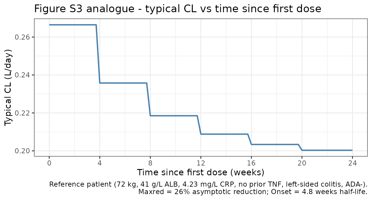 ADA_TITER = 0is the appropriate reference for reproducing the published figures. Users simulating ADA-positive patients should supply a time-series of titer values per subject. - Reference CRP. The model centers CRP at 4.23 mg/L (the reference- patient value reported in the Figure 1 caption). The population baseline median CRP is 4.31 mg/L (Table 3); both values produce effectively identical exposures.