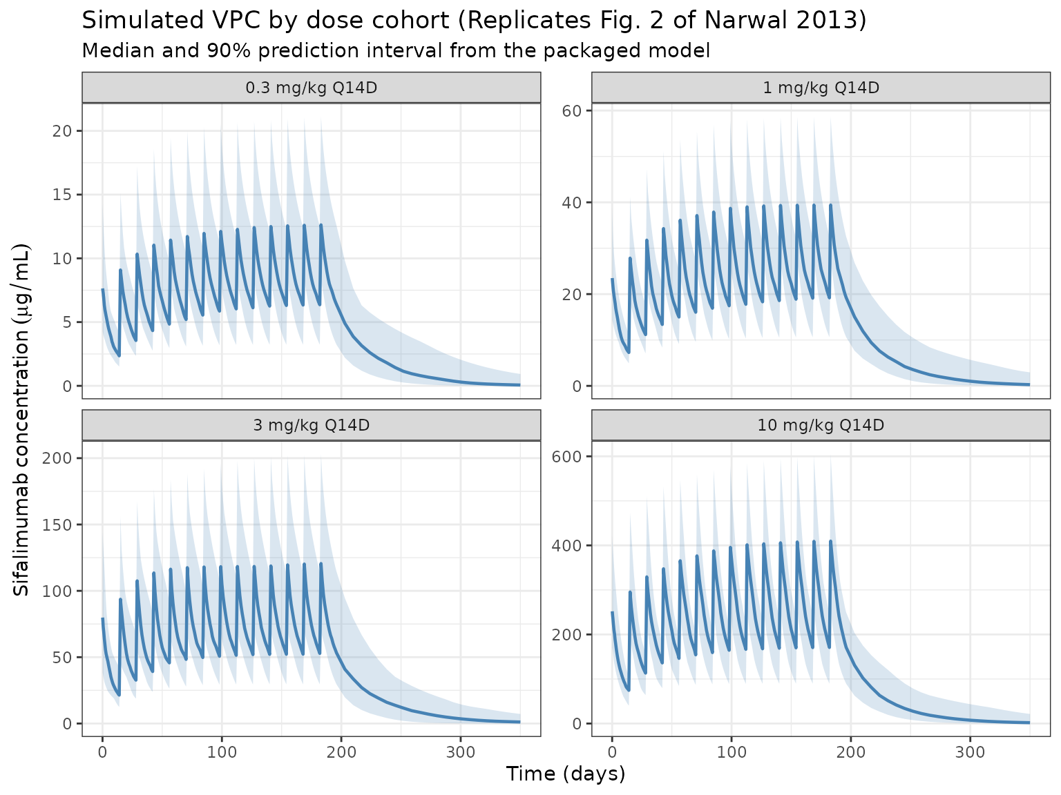 STEROIDdefault. The phase IIb simulations in the paper set BSTEROID = 0 (no baseline steroid use) as the reference. The virtual cohort above does the same; setSTEROID = 1per subject to simulate the +19.5% CL effect for concomitant-steroid users. - Monthly dosing interval for Table 3. Narwal 2013 Table 3 is labelled “monthly” without a numeric dosing-interval definition. The replication above uses every 28 days with an additional loading dose at Day 14, which matches the description in Section 3.2.2 and the phase IIb study protocol NCT01283139.