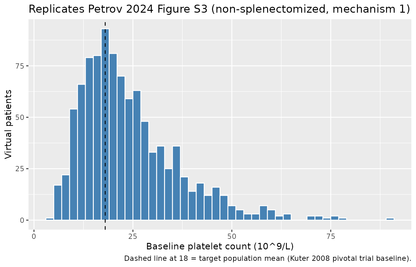 Petrov 2024 Figure S3 shows the simulated baseline platelet distribution of 1000 virtual non-splenectomized ITP patients without drug, alongside the log-normal target derived from the romiplostim-ref pivotal trial (mean 18 ×10^9/L, CV 35%). The simulated histogram from the packaged model is below.
