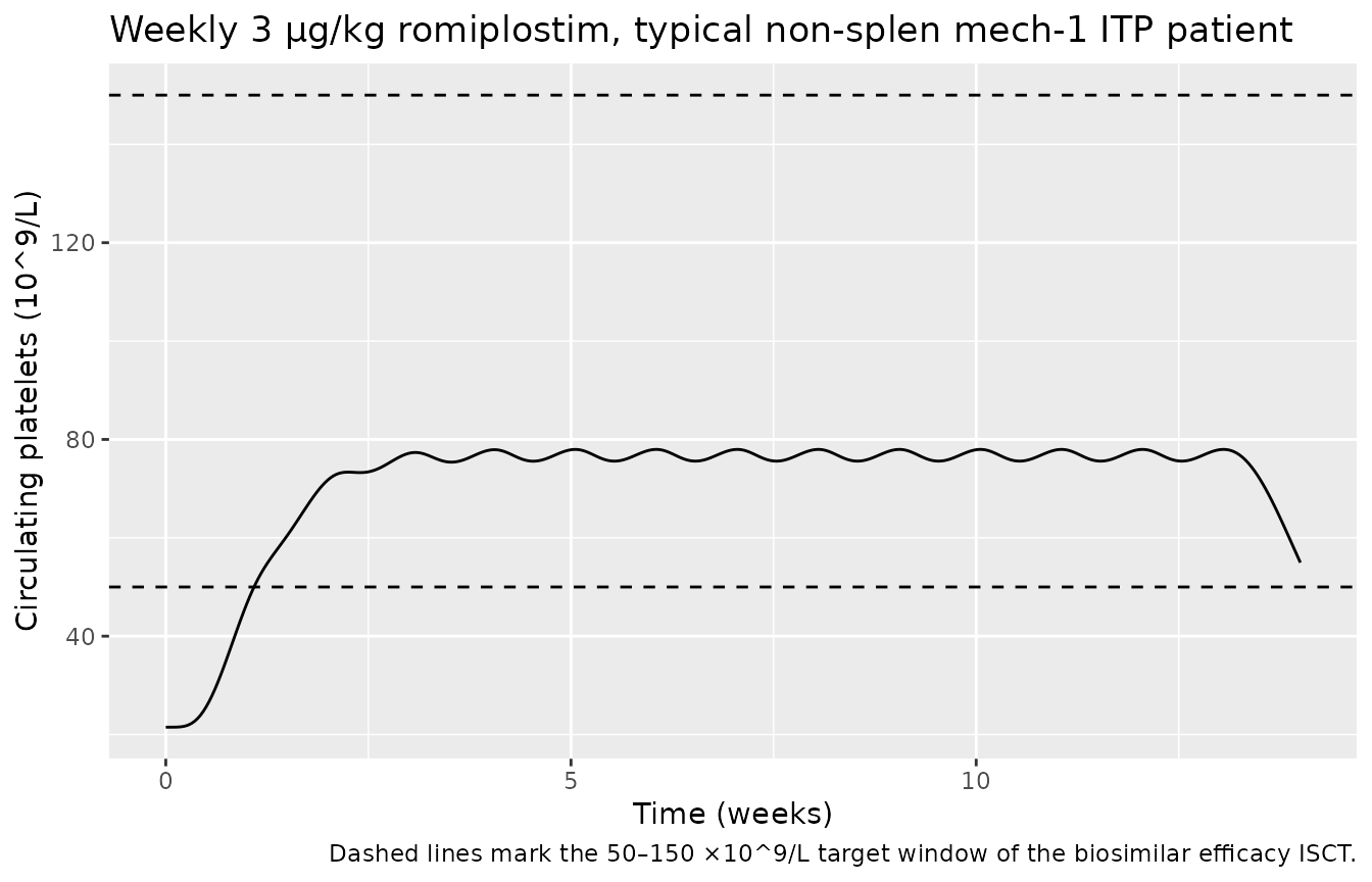 Weekly subcutaneous dosing at 3 µg/kg in a typical non-splenectomized mechanism-1 patient drives circulating platelets above the 50 ×10^9/L threshold used to define platelet response in the pivotal trial. The Petrov 2024 ISCT (Methods, “In Silico Biosimilar Efficacy Trial”) uses a weekly dose-titration algorithm (start 1 µg/kg, max 10 µg/kg) targeting platelets 50–150 ×10^9/L; a faithful replication of that algorithm is beyond the scope of this packaged model and would be implemented in user code that calls the model in a loop with a feedback controller.