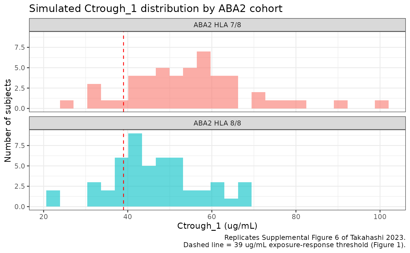 Takahashi 2023 does not publish a per-cohort NCA table; the exposure-response analysis (Supplemental Figure 14) reports correlations among Ctrough_1, Cmax_1, and AUC1 in the ABA2 developmental cohort but does not give summary statistics for Cmax_1 or AUC1. Supplemental Figure 8 reports the Ctrough_1 quartile bins 20-32 / 33-43 / 44-55 / 56-95 ug/mL, which are the only published exposure-distribution numbers we can verify.