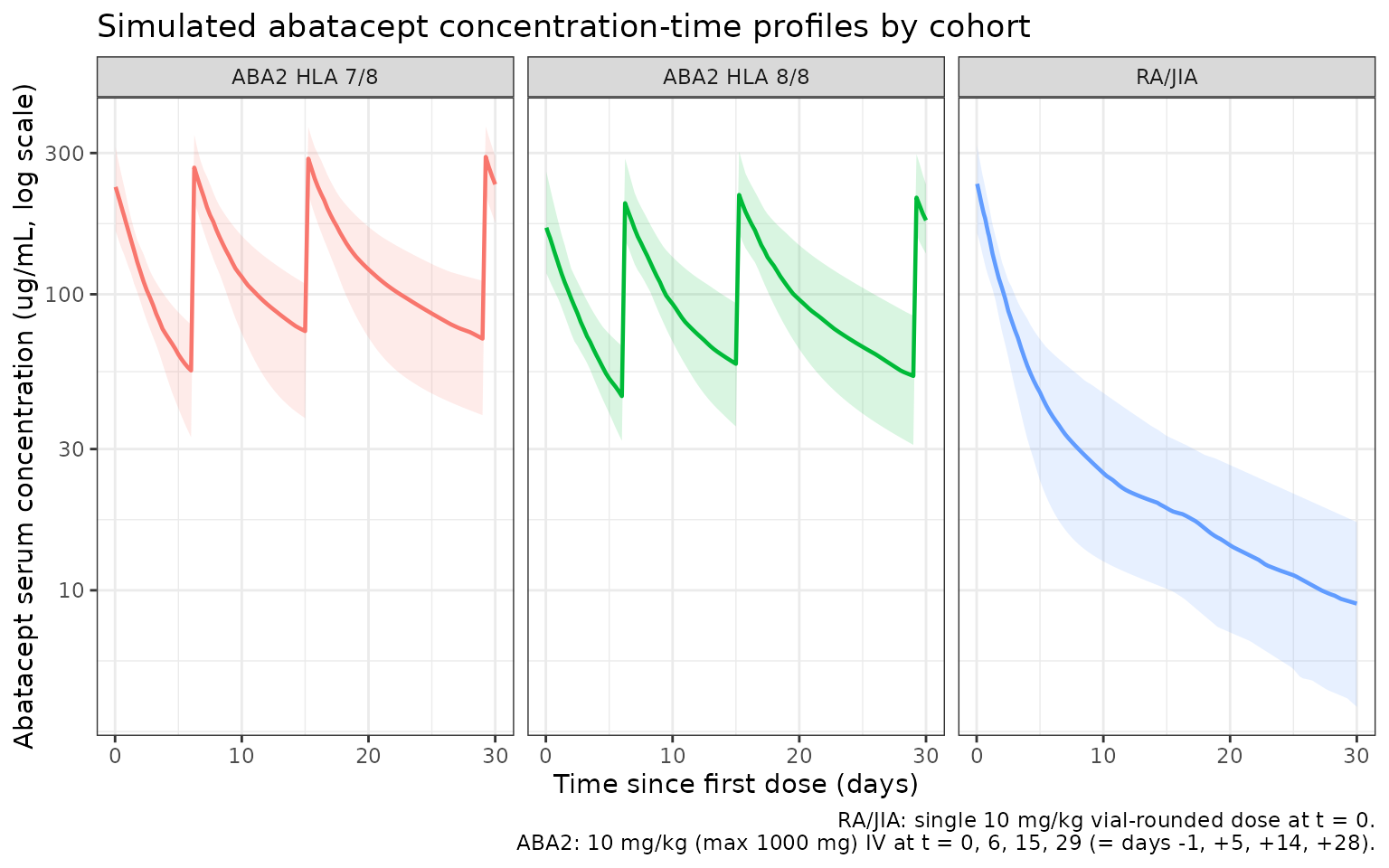 title = "Simulated abatacept concentration-time profiles by cohort",
