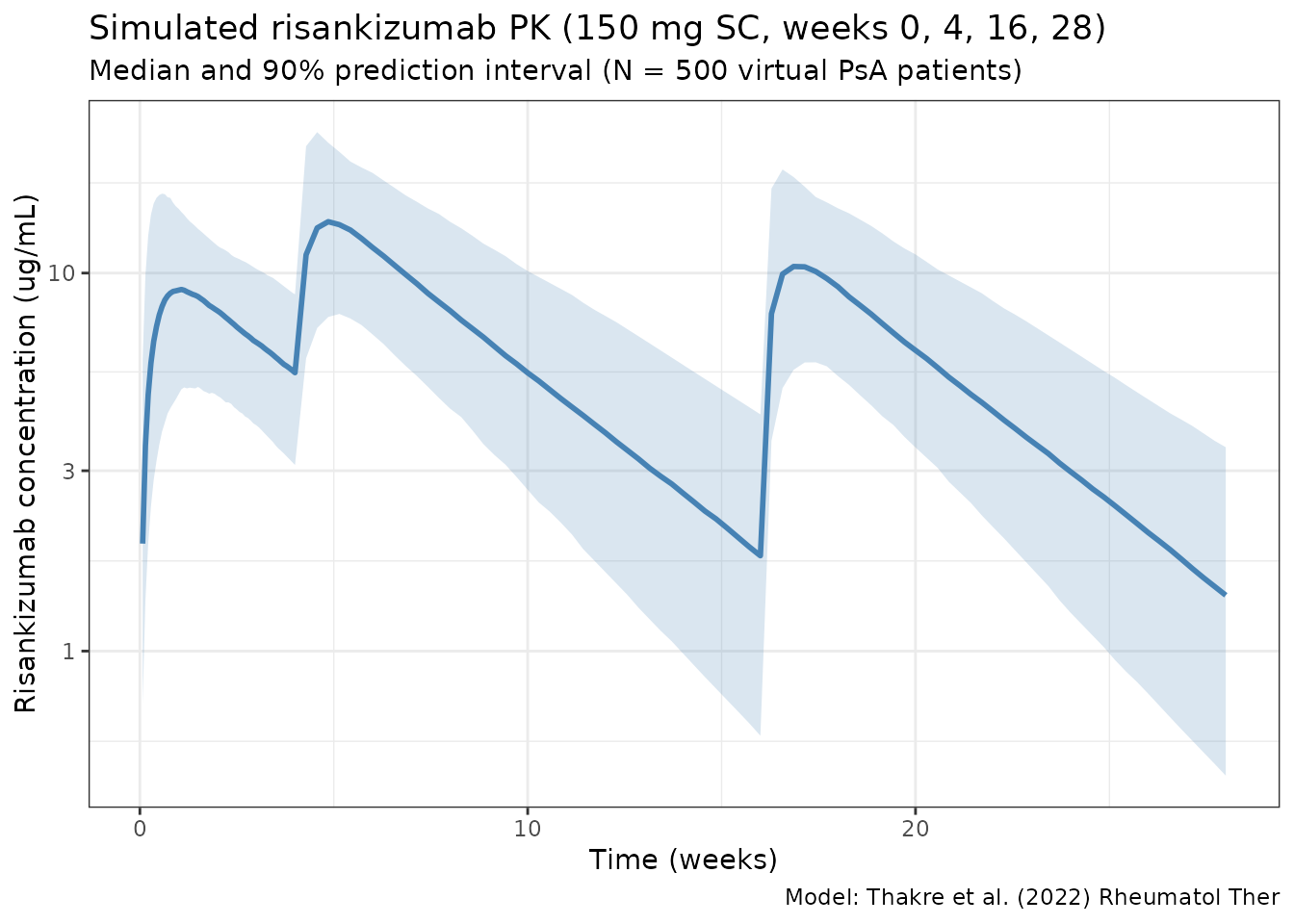 - Dosing regimen uses the approved PsA label (150 mg SC at weeks 0 and 4, then every 12 weeks). Thakre 2022 included earlier dose-ranging phase 1 / 2 data; those regimens are not simulated here.