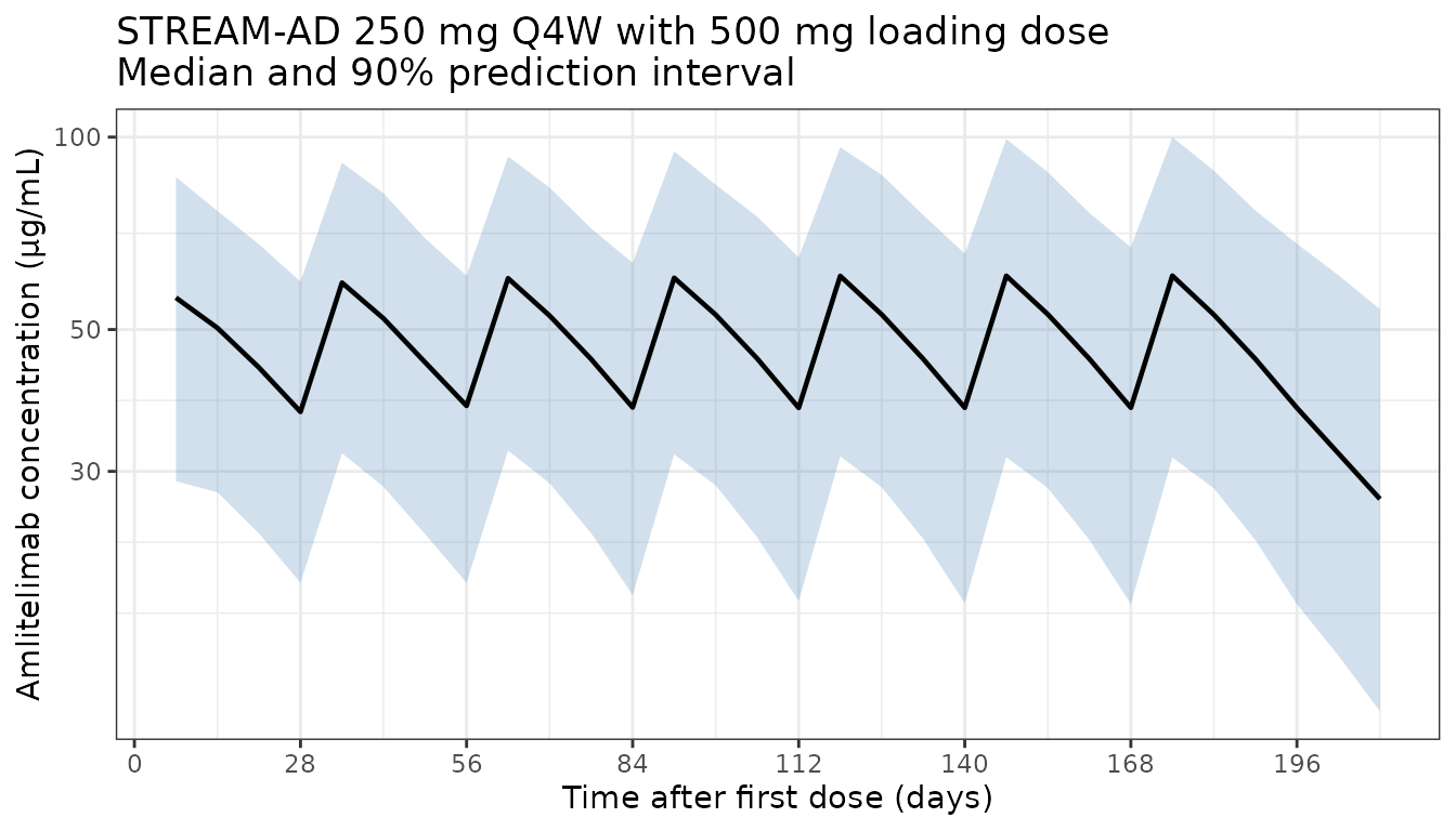 title = "STREAM-AD 250 mg Q4W with 500 mg loading dose\nMedian and 90% prediction interval"