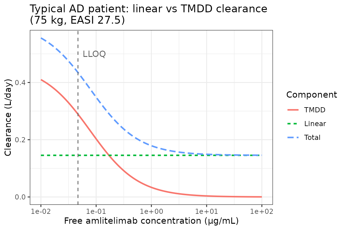 title = "Typical AD patient: linear vs TMDD clearance\n(75 kg, EASI 27.5)"