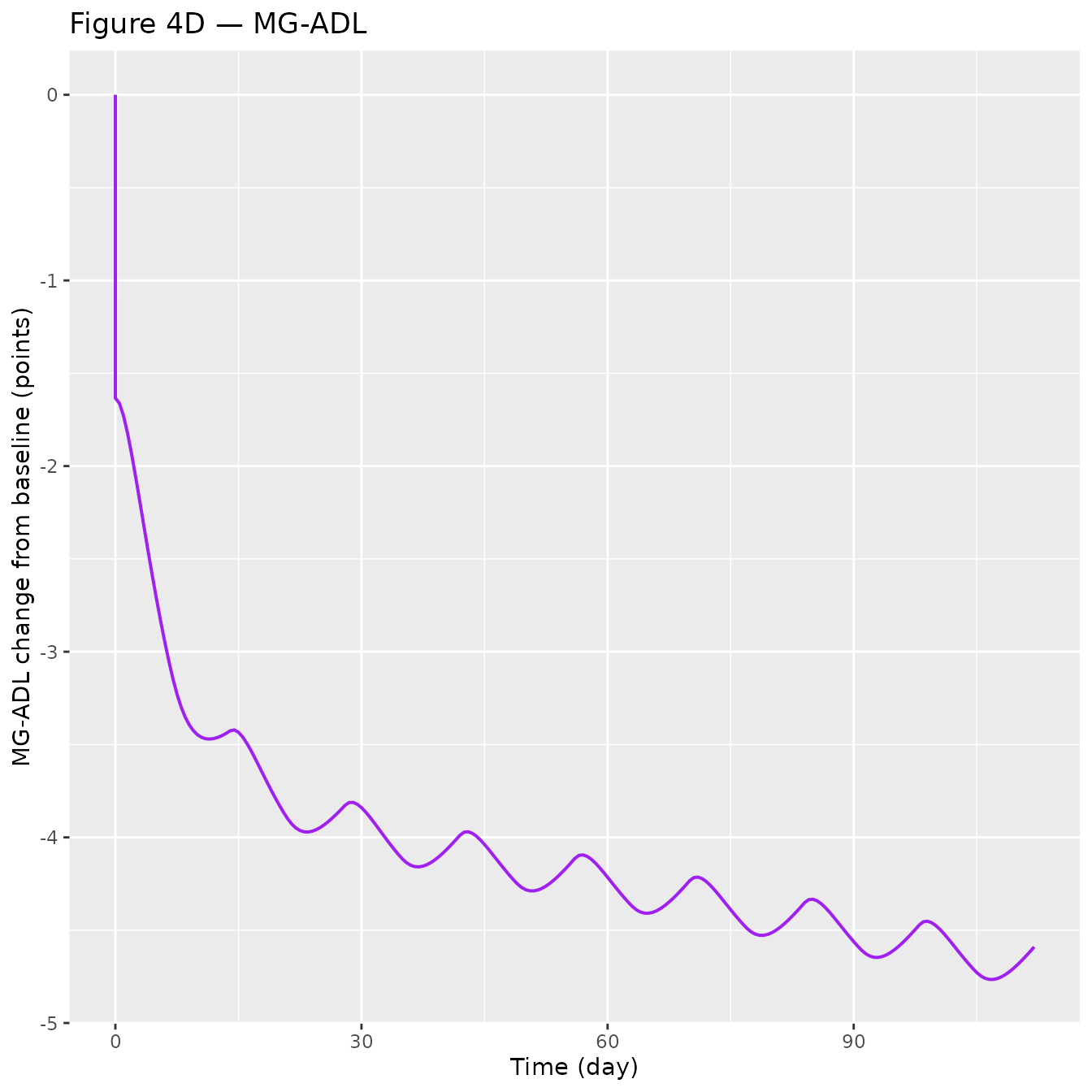 S_IgGunit conversion. Table 3 labelsS_IgGas “points per 10 % IgG reduction”, while Supplement Equation 6 writes the MG-ADL IgG term asS_IgG × IgG_EC × (BL/7)^E_IgGwith the effect-compartment outputIgG_ECas a dimensionless fraction (0 at baseline, 1 at full blockade). To reconcile, the model multipliesS_IgG × effectby 10 insidemodel()so the product has dimensions of points. Tested against the paper’s quoted −1.94 point reduction at 70 % IgG CFB and MG-ADL₀ = 9.8 (page 2083). -