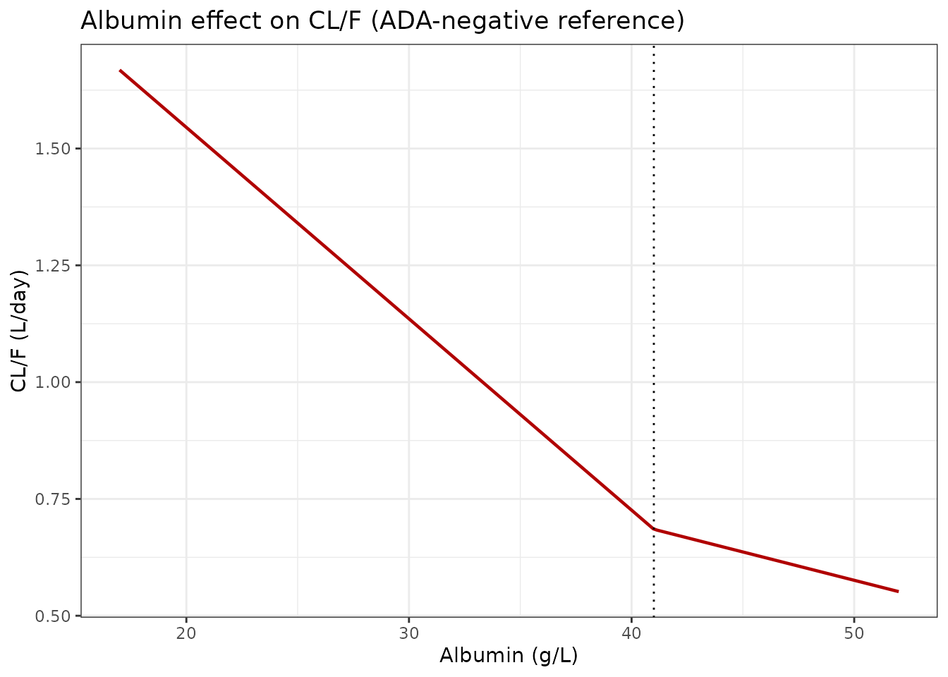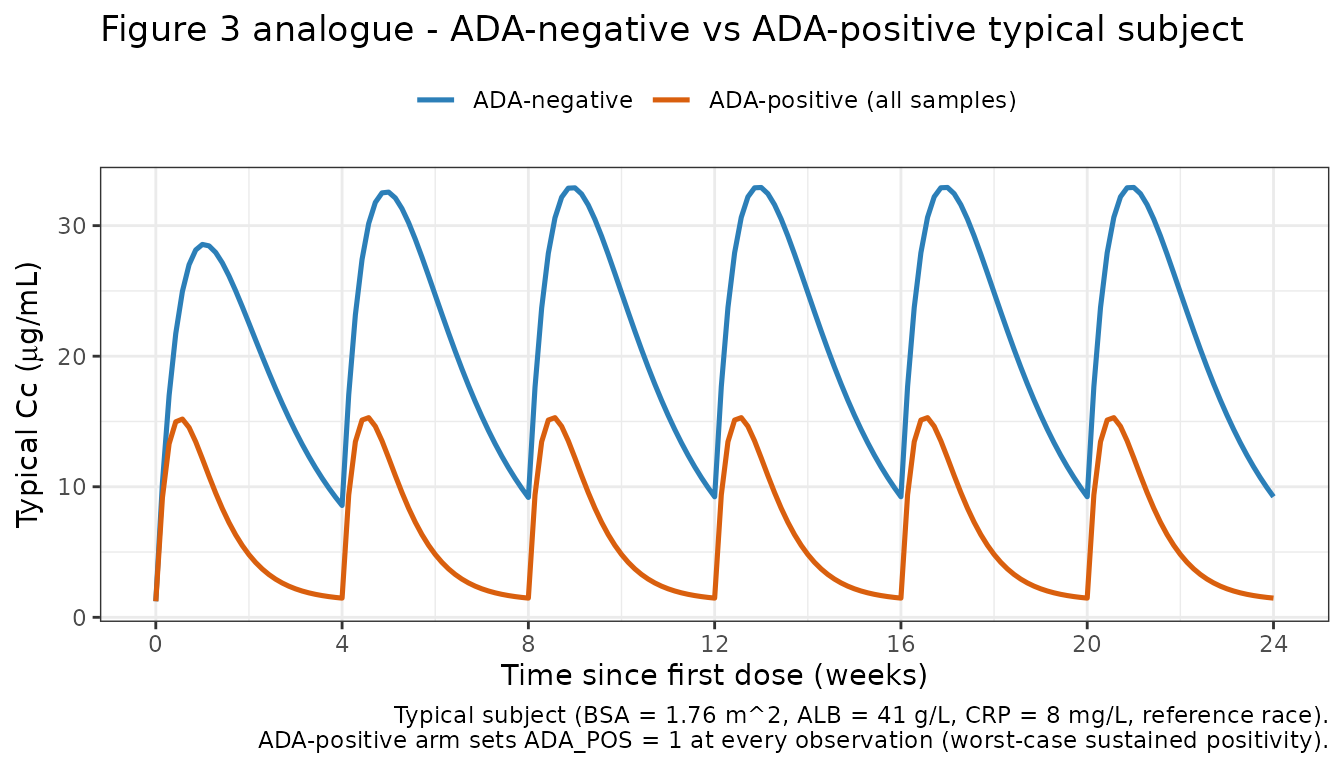 etalcl/etalbaselinein-file comments for users who want to simulate a worst-case ADA-positive arm. - Time-varying ADA status. ADA_POS is supplied per observation in the event dataset (Wade 2015 coded ATB at the concentration level, not per subject). The primary virtual cohort is ADA-negative at every time point; the ADA-positive comparison arm sets ADA_POS = 1 at every observation to show the maximum model-predicted effect. Real applications should supply the observed per-sample ATB status.