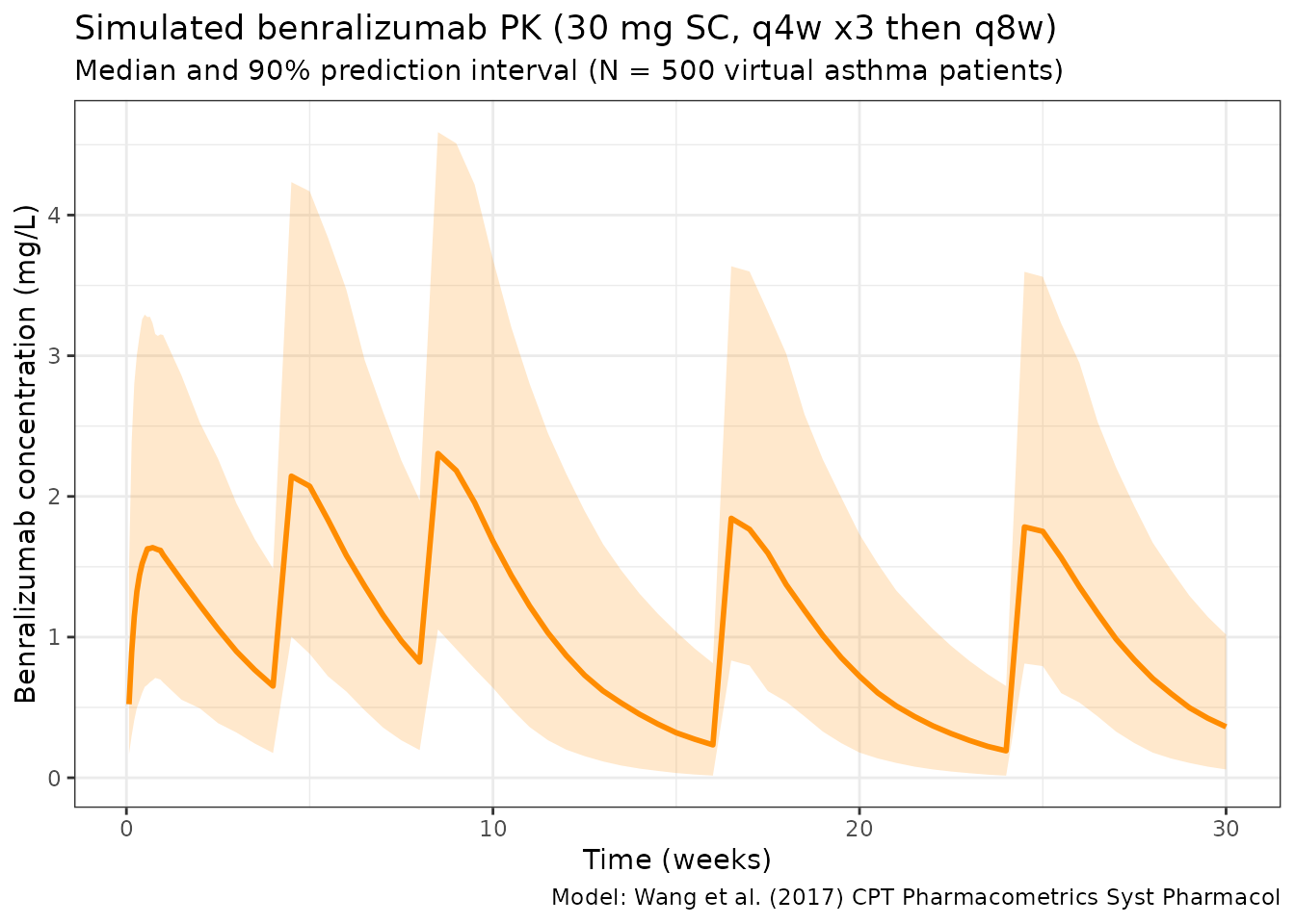 title = "Simulated benralizumab PK (30 mg SC, q4w x3 then q8w)",