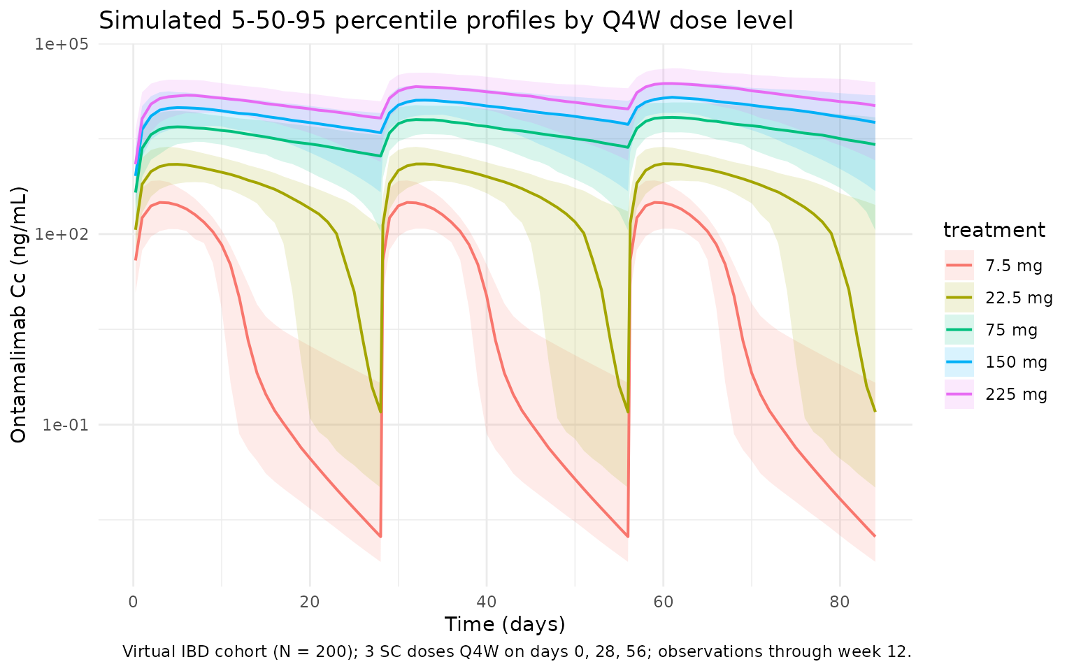 caption = "Virtual IBD cohort (N = 200); 3 SC doses Q4W on days 0, 28, 56; observations through week 12."