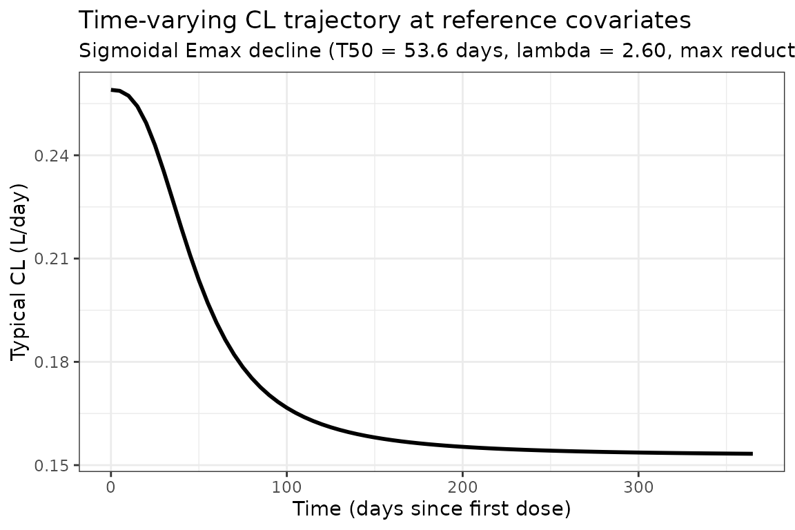 The structural model is a two-compartment IV model with time-dependent clearance parameterized as a sigmoidal-Emax function of time since the first dose: