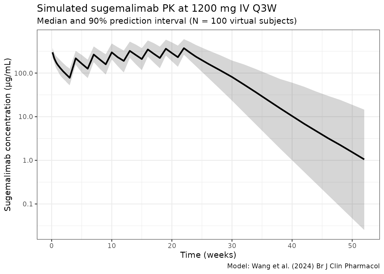 Sugemalimab is a fully human IgG4 monoclonal antibody that targets programmed death-ligand 1 (PD-L1). Wang et al. (2024) developed a pooled population pharmacokinetic model from nine Phase I-III sugemalimab trials in patients with advanced solid tumours or lymphomas (1,628 subjects; 11,040 PK observations).