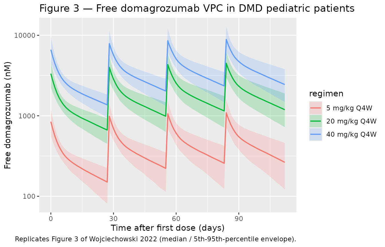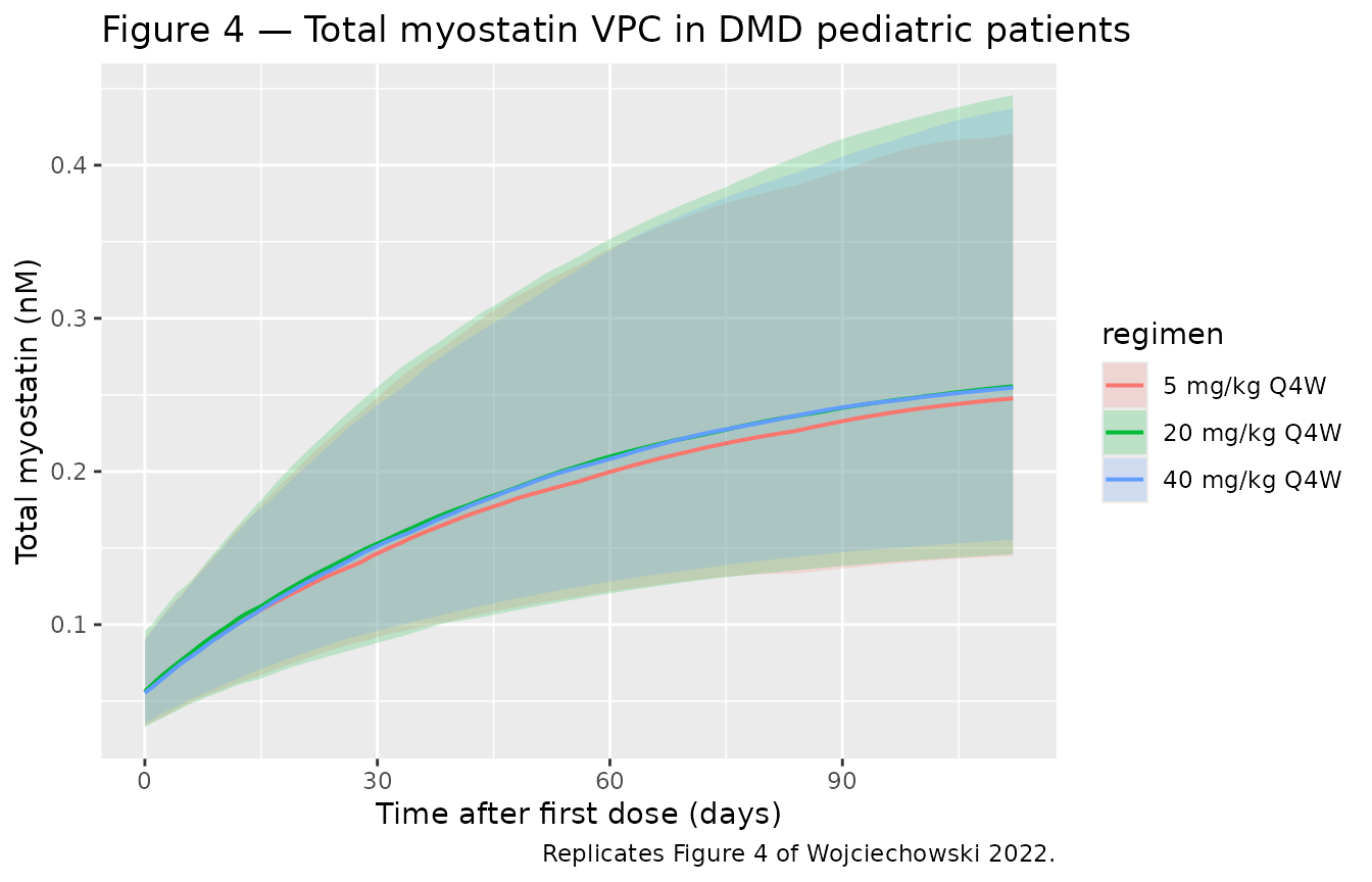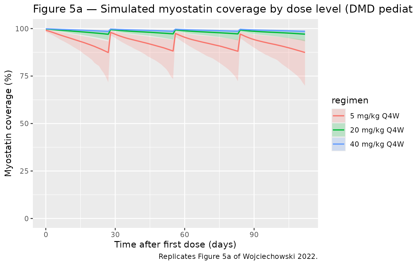 caption = "Myostatin coverage in DMD pediatric patients: simulated vs. Wojciechowski 2022 Results.")| Regimen | Published median (95 % PI) | Simulated median (95 % PI) |
