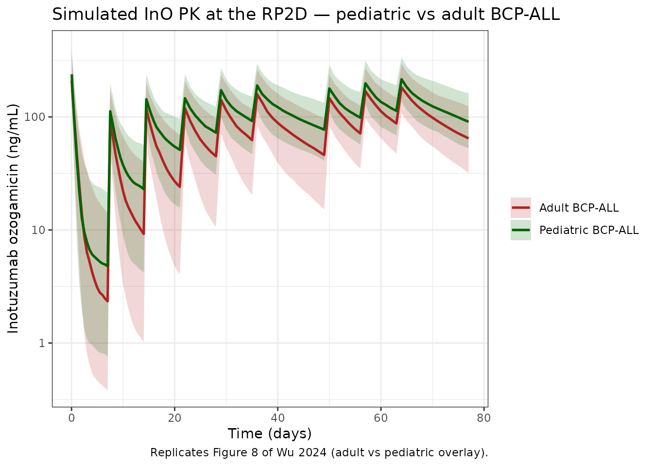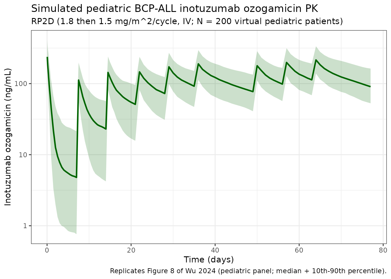 Simulate inotuzumab ozogamicin (InO) concentration-time profiles using the final population PK model of Wu et al. (2024). The model was developed by reanalyzing the Garrett 2019 adult InO population PK model on a pooled adult + pediatric dataset (8924 serum InO concentrations from 818 patients across 12 studies — 531 adult B-cell non-Hodgkin lymphoma (NHL), 234 adult B-cell precursor acute lymphoblastic leukemia (BCP-ALL), and 53 pediatric BCP-ALL participants from ITCC-059) and adding pediatric-specific covariate effects. The structural model is a two-compartment disposition with IV input and a total clearance that sums a linear component (CL1) and a time-decaying target-mediated component (CLt = CL2 * exp(-kdes * time)).