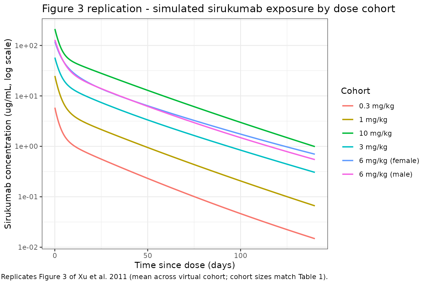 - Sex. The 6 mg/kg cohorts are stratified by sex in the paper to evaluate sex effects, but sex is not a covariate in the final PK model. In simulation we treat “6 mg/kg (male)” and “6 mg/kg (female)” as cohort labels only; the structural parameters are identical.