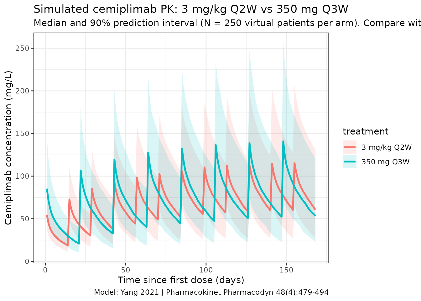 title = "Simulated cemiplimab PK: 3 mg/kg Q2W vs 350 mg Q3W",