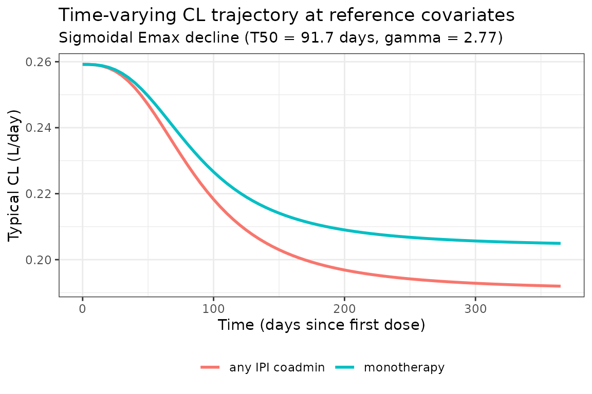 The typical-subject CL trajectory across the first year reproduces the sigmoidal Emax decline that motivates the time-varying-CL parameterization. At a male, 80 kg, eGFR 90 patient on monotherapy, CL drops from 0.259 L/day at t = 0 to 0.259 * exp(-0.240) = 0.204 L/day at full Emax saturation (, or about 5 months).