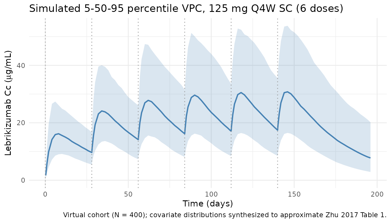 FORM_NS0 = FORM_CHO_PHASE2 = 0for all simulated subjects so that the vignette characterizes the commercial formulation; the NS0 and CHO-Phase-2 effects are available in the model and could be activated by setting the corresponding indicator to 1. - ADA status fixed to negative. ADA_POS = 0 for all subjects (ADA prevalence in the Zhu 2017 cohorts was low and time-varying); the CL effect of 1.04 can be activated by setting ADA_POS = 1 for an individual.