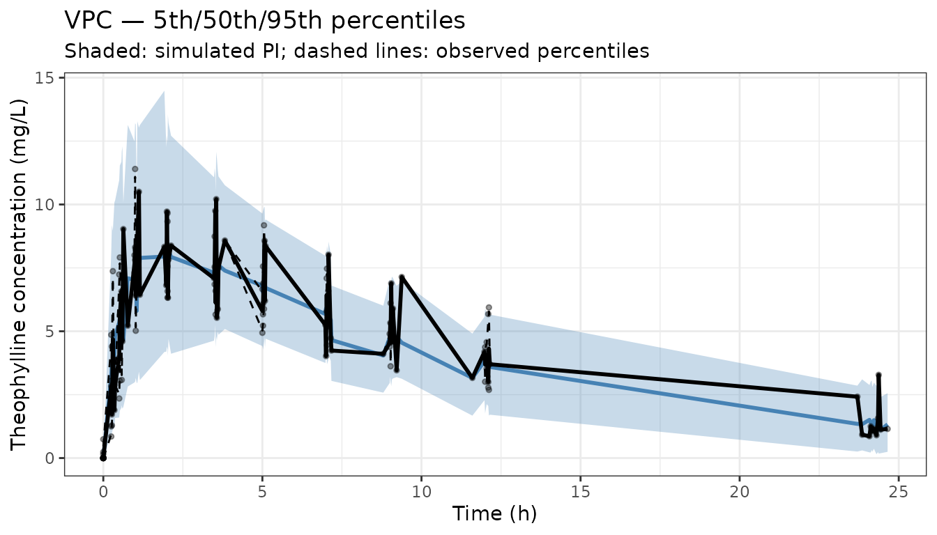 A visual predictive check (VPC) is a simulation-based diagnostic that compares the distribution of observed data to the distribution of model-predicted data. The observed data are overlaid on prediction intervals (e.g. 5th, 50th, 95th percentiles) computed from many simulated replicates of the study design. A well-fitting model produces prediction intervals that envelop the observed percentiles.